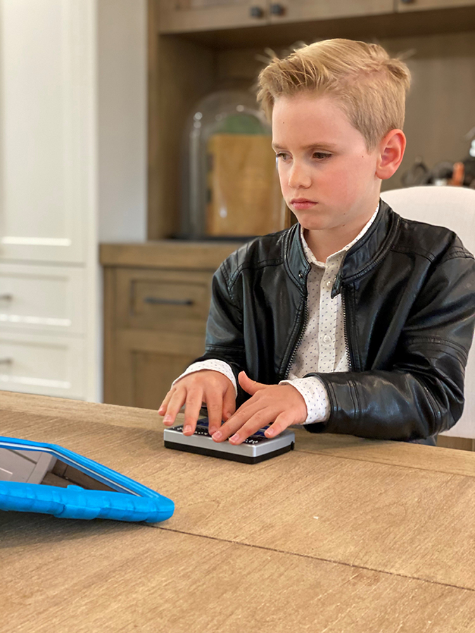 Despite no in-person schooling, Maxen receives Braille and other important low vision instruction at home to complement his school learning. He works with his BCLC Teacher of the Visually Impaired via video conference. Maxen’s parents are there to help facilitate.