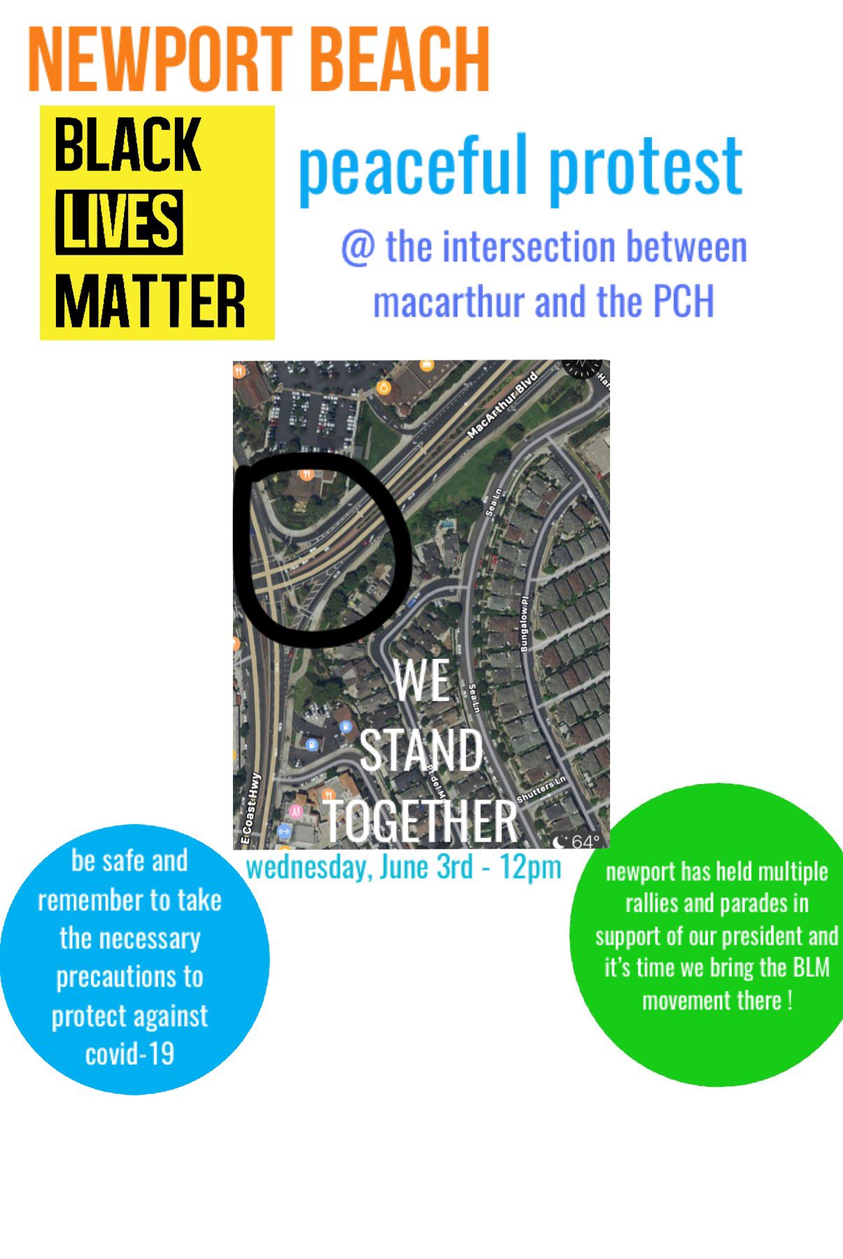 According to information contained in an email sent from the Corona del Mar Chamber of Commerce & Business Improvement District today, there is a peaceful protest scheduled for Wednesday, June 3 at the intersection of Coast Highway and MacArthur Blvd. from noon to 3 p.m.