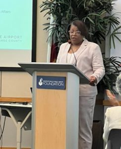Reynolds initiated the discussion of airport noise with a “drumroll please” quip in deference to how important the matter is to the community. She is working with the county on a soon to be launched “Fly Friendly” initiative that encourages general aviation jet operators to be good partners with the community and voluntarily work toward meaningful noise reduction. She also forges relationships with airlines to add newer aircraft with quieter and cleaner operations.